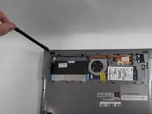 Осторожно отожмите 3 защёлки, удерживающие крышку отсека жесткого диска, пластиковой лопаткой.
