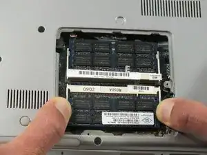 Используйте два больших пальца, чтобы отжать два пластиковых фиксатора вокруг другой оперативной памяти.