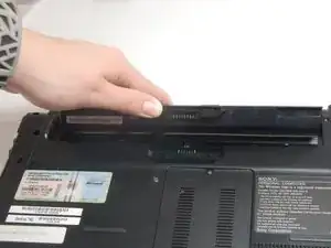 Используйте ноготь или пластиковый инструмент, чтобы поднять аккумулятор. Поверните аккумулятор вверх и в сторону, чтобы извлечь его из ноутбука.