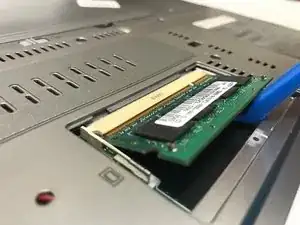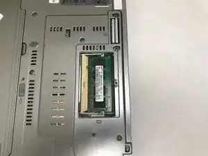 Удалите один винт Phillips, который соединяет маленькую пластину с нижней частью ноутбука. Поднимите пластину, чтобы получить доступ к модулю оперативной памяти.