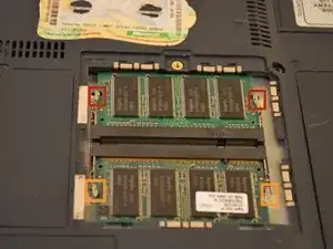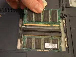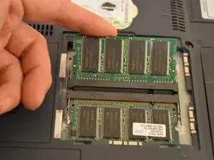 Этот ноутбук поддерживает максимум два модуля памяти. Максимальный объём каждого — 256 МБ PC1600 DDR SDRAM.
