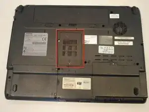 Определите прямоугольную пластиковую крышку оперативной памяти, расположенную в нижней части ноутбука.