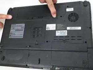 Сдвиньте защелки, помеченные #1 и #2, расположенные снаружи отсека для батареи, друг от друга.
