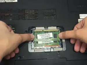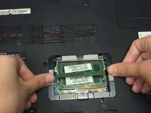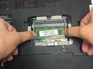 Удалите нижний чип оперативной памяти из сокета, аккуратно удерживая его за левый и правый края и тянув чип к себе, пока он полностью не освободится от компьютера.