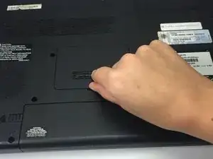 С помощью отвертки Phillips 0 открутите винт с головкой Phillips размером 2 мм на нижнем крае панели оперативной памяти (расположенной в центре нижней части ноутбука), поворачивая винт против часовой стрелки.