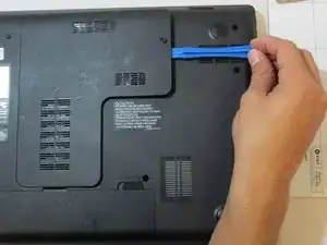 Используйте пластиковый инструмент для открытия, чтобы открыть крышку доступа, вставив его в вырез рядом с винтом и поддев крышку доступа (L-образную) от устройства.