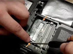 Шаг 4: Используя большие пальцы, освободите защелки с каждой стороны чипа, одновременно отодвигая каждую защелку от оперативной памяти. Эти защелки фиксируют чип на месте, и когда вы их освободите, чип "выпрыгнет" вверх.
