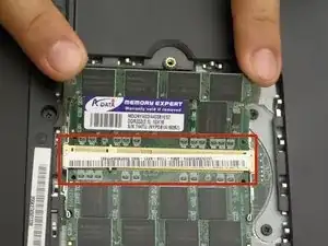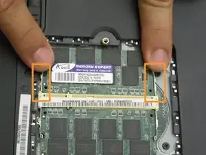 Используйте пальцы обеих рук, чтобы отвести две серебряные скобы от сторон планки оперативной памяти.
