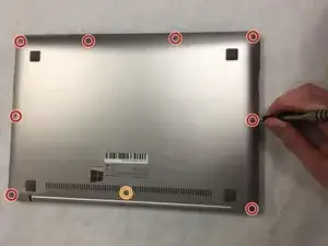 Отвинтите восемь винтов длиной 3 мм на нижней панели ноутбука по периметру с помощью отвертки Torx T5.