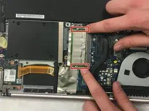 Осторожно разъедините два зажима, обведенные красным, чтобы модуль оперативной памяти поднялся.