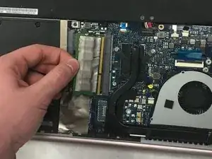 Удалите модуль оперативной памяти из слота SO-DIMM, удерживая его за края.