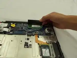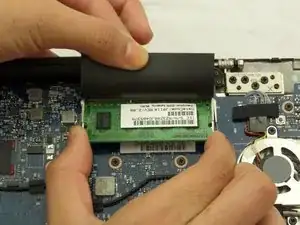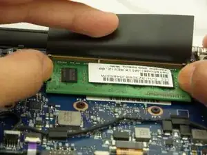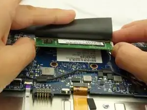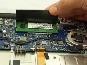 Найдите оперативную память под черной крышкой рядом с тем местом, где экран ноутбука встречается с корпусом устройства.