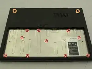 Сначала разместите компьютер так, чтобы серебряный отсек для батареи был ближе к вам. Затем с помощью отвертки Phillips #00 открутите десять винтов по 3 мм в отсеке батареи.
