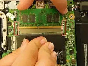 Чтобы извлечь модуль оперативной памяти, аккуратно раздвиньте металлические зажимы с обеих сторон модуля.