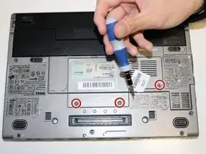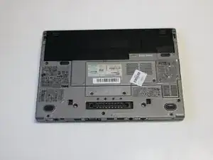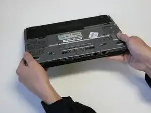 Переверните ноутбук так, чтобы батарея была обращена вверх, а логотип Dell — вниз на поверхность, на которой стоит ноутбук.