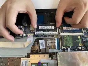 Используйте пальцы и оттолкните два зажима наружу, чтобы освободить планку оперативной памяти.