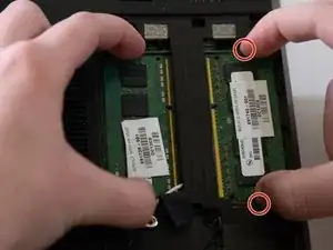 Нажмите на две защелки по обеим сторонам каждого чипа ОЗУ, чтобы освободить чипы.