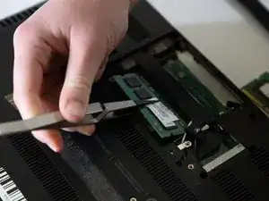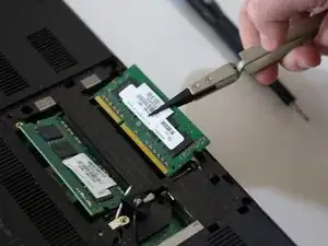 Используя пару пинцетов, защищенных от статического электричества, осторожно выньте два модуля памяти из сборки.