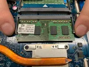 Чтобы освободить оперативную память, удерживайте и тяните ленты в стороны с обеих сторон оперативной памяти.