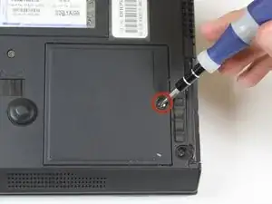 Удалите винт Phillips #0 размером 4 мм, расположенный на панели в нижнем правом углу ThinkPad.