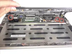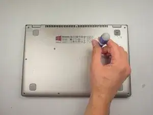 Используйте крестовую отвертку, чтобы удалить два винта под резиновыми накладками, которые фиксируют клавиатуру.