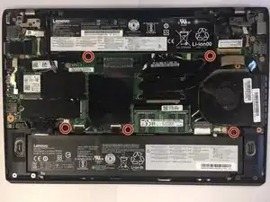Удалите пять винтов Phillips #1 длиной 5,5 мм, крепящих две батареи.