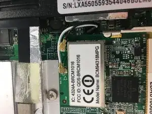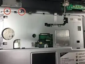 Используя отвёртку Phillips #0, выверните два отмеченные винта длиной 5 мм, чтобы получить доступ к внутренней части ноутбука.