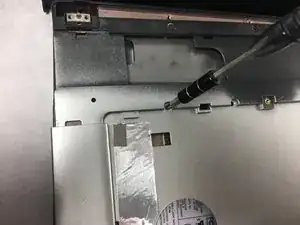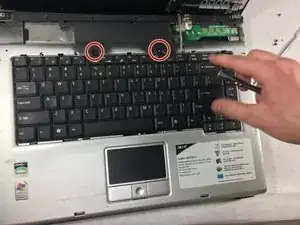 Используя отвёртку Phillips #0, выверните два винта, удерживающих клавиатуру на месте.