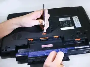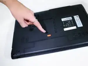 Удерживая оранжевый переключатель на месте, поднимите батарею за край и потяните её от ноутбука.