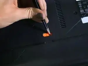 Используя небольшой инструмент, например, пинцет или ручку, сдвиньте оранжевый переключатель полностью влево, чтобы разблокировать батарею.