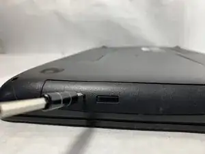 Осторожно вставьте зонд или скрепку в отверстие для иглы извлечения, чтобы выдвинуть траверсу оптического привода.