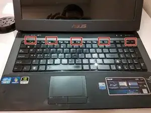Вставьте лопатку или пластиковый инструмент в эти пять слотов и подденьте вверх, чтобы поднять клавиатуру.