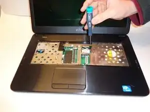 С помощью лопатки отодвиньте защелки от клавиатуры и поднимите клавиатуру вверх от ноутбука.