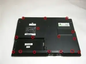 Снимите винты с нижней части ноутбука, как показано на картинке.