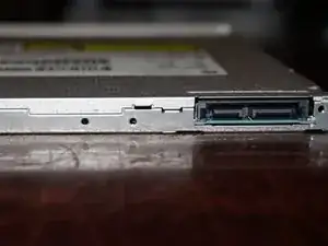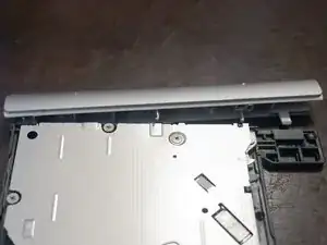 Чтобы снять лицевую панель, откройте оптический привод с помощью скрепки. После освобождения лотка используйте плоский инструмент, чтобы отщёлкнуть видимую защёлку на лицевой панели. После этого лицевую панель можно снять.