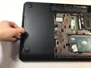 Сдвиньте сервисную панель в вашу сторону, чтобы освободить её от корпуса ноутбука.