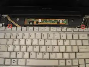 Как только все фиксаторы освободятся, медленно поднимите нижнюю часть клавиатуры, удерживая верхнюю часть наклонённой вниз. Осторожно поворачивайте клавиатуру, пока не получится добраться до ленточного кабеля, соединяющего её с компьютером.