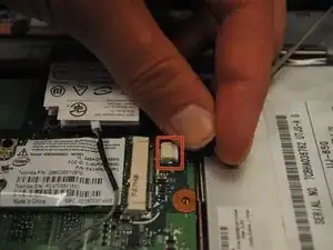 Сдвиньте бежёвый кабель, как показано на фото, чтобы отсоединить его.
