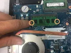 Используя палец, отведите две маленькие штифты от оперативной памяти, чтобы она приподнялась.