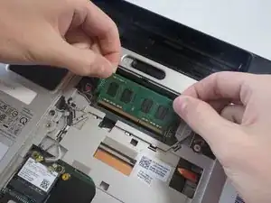 Используйте черную лопатку, чтобы нажать на фиксаторы, удерживающие ОЗУ, в стороны. Вы должны услышать щелчок.