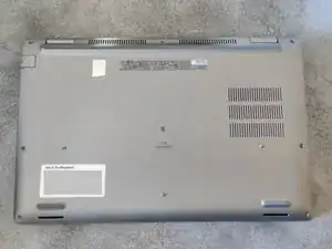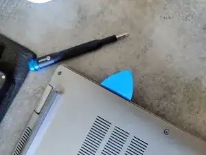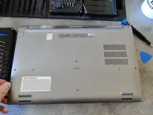 Отключите ноутбук от зарядного устройства, переверните его крышкой вниз, выкрутите 9 фиксированных винтов (они не выпадут из нижней крышки) и с помощью лопатки Mediator аккуратно пройдитесь по всем сторонам корпуса, чтобы поддеть и снять нижнюю крышку.