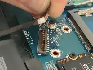 Отключите батарею, потянув за чёрную язычок на белом разъёме. Сильно тянуть не нужно.