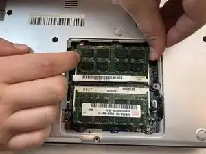 Чтобы удалить ОЗУ, используйте пальцы, чтобы нажать металлические фиксатор на белых держателях наружу.