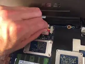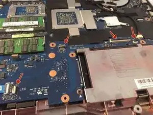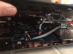 Медленно приподнимите клавиатуру, чтобы увидеть 4 ленточных кабеля, и аккуратно подденьте фиксаторы, где подключены кабели.