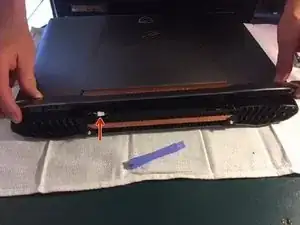 После снятия крышки петли и поддевания задней панели переверните ноутбук и откройте экран более чем на 90°.