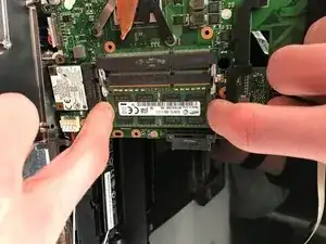 Возьмите двумя пальцами и потяните за фиксирующие слоты наружу. ОЗУ должно легко выскочить. Уберите старую планку и аккуратно вставьте новую в слот.