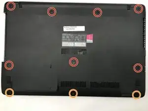 Поставьте ноутбук экраном вниз и снимите винты длиной 14 мм и 4 мм на нижней части ноутбука. Найдите все 10 винтов и полностью их отвинтите.