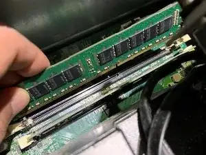 Аккуратно вставьте ОЗУ в сокет, пока не услышите щелчок язычков с Шага 3.