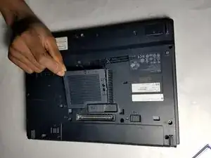 В центре нижней части ноутбука находится панель с двумя винтами. С помощью отвертки JIS #1 отвинтите оба.