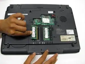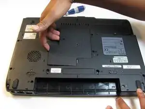 Переверните ноутбук и сдвиньте правую фиксирующую защёлку наружу.